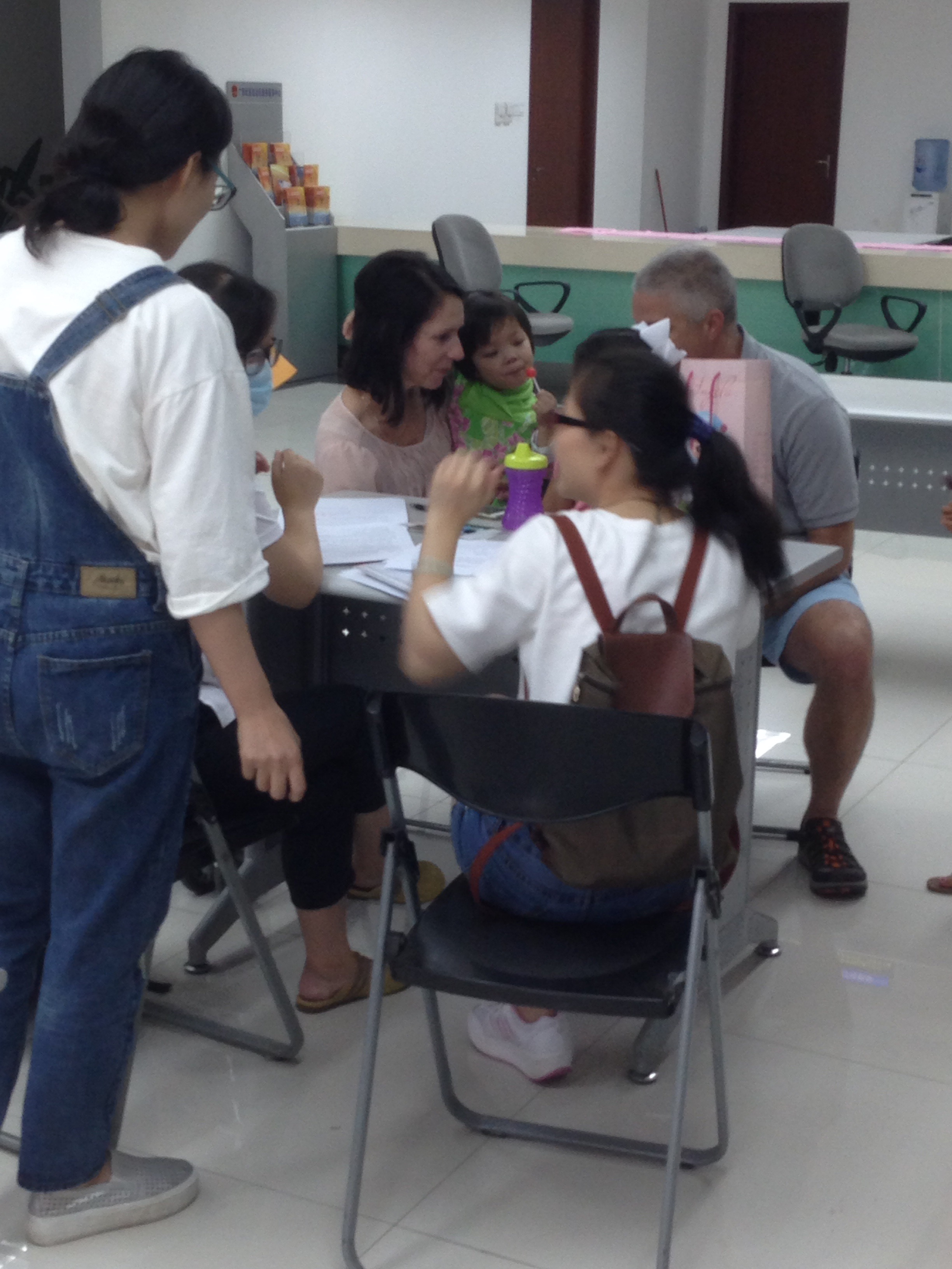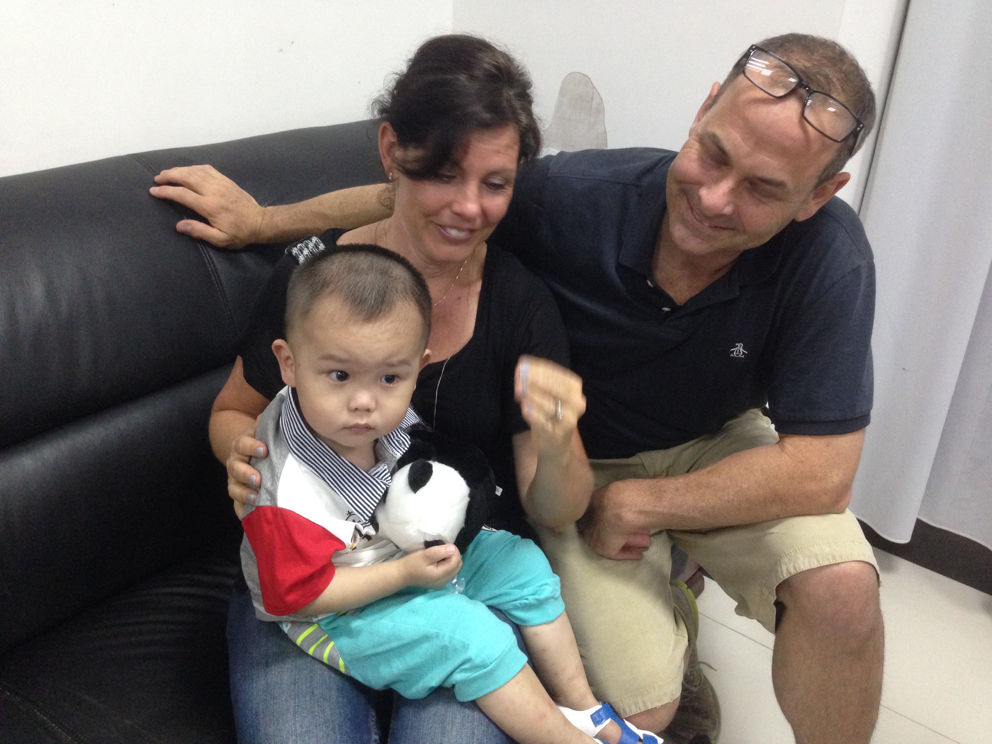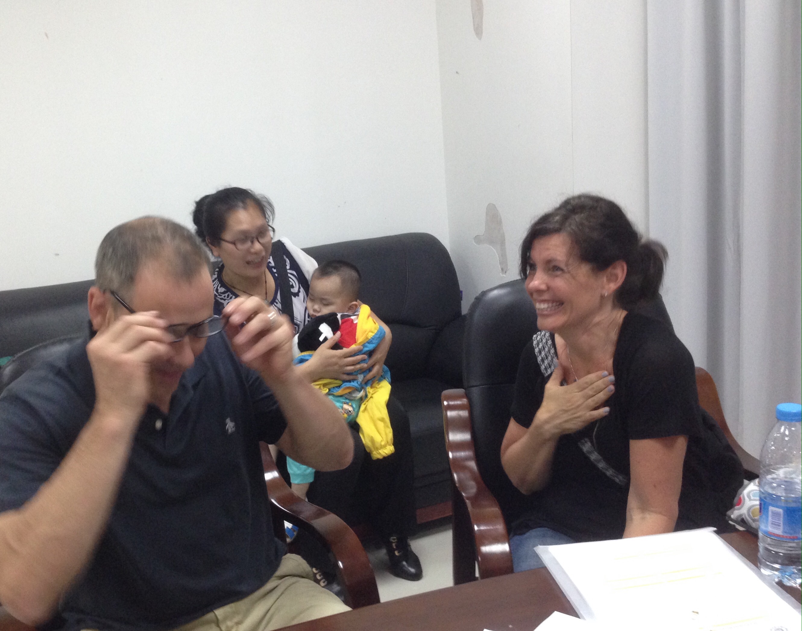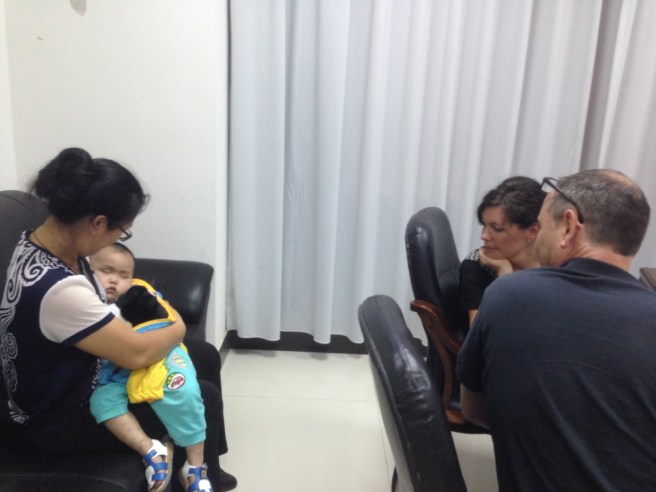 We walked in to see this glorious sight. Our new friends were already there getting their precious new daughter! There is no telling what I wrote on that paperwork since my hand was shaking and I was so nervous. As usual, Blake was calming yet he was eager to see Theodore as well. We saw glimpses of him in a side room and that got us pumped up! And then one of the orphanage nannies came in carrying our sleeping son. And then all the workers start talking in Chinese something like ,”Give mama baby. ” So I jump up and reach for him as soon as we got the go ahead! For the first few minutes, he cut his eyes up at Blake and I . Then he realized his situation when one of the orphanage workers speaks. And the tears start flowing for him, the workers, of course me, and even Blake. ο»Ώ
