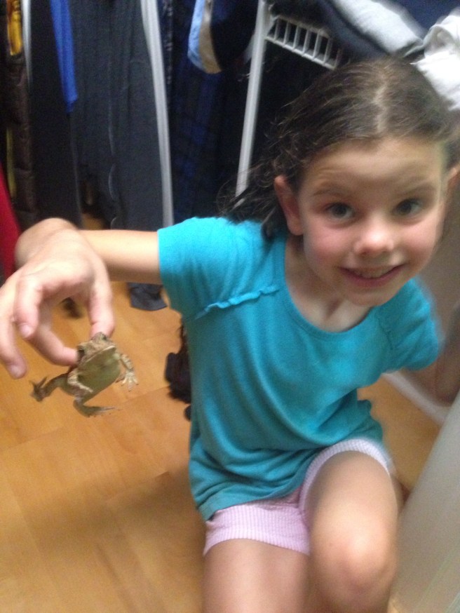 • One day over the past 6 weeks, the kids “forgot” that they brought 17 frogs in the house in a bucket. In which the frogs easily found a way out. The one below was hopping into our closet in which I asked for back up help…..
