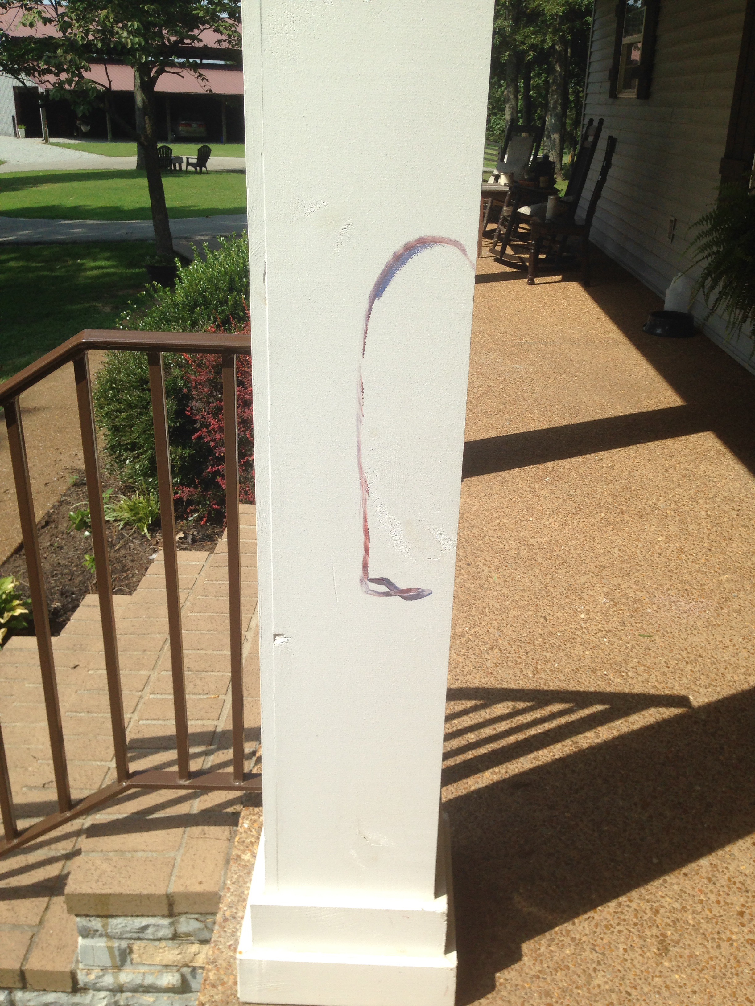 The final trail of paint was discovered on our white columns when perhaps he decided they could use some jazz- and you got it,