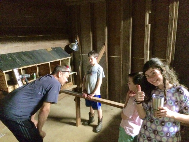 1. I simply love all the pictures. Favorite is the one of the kids in the wheelbarrow and Sophia Blake standing on the handles. Looks like Blake did a wonderful construction job. I grew up with lots and lots of chickens but don’t have any good advice for you. Mother had a 1000 White Rocks one year. Believe me there were chickens everywhere. Thanks for sharing.
